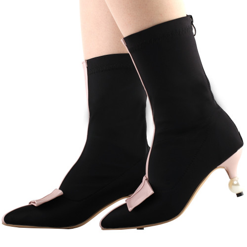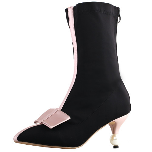 SHOW STORY Retro Two Tone Bow Pointed Toe Exquisite Pearl Heel Dress Ankle Bootie