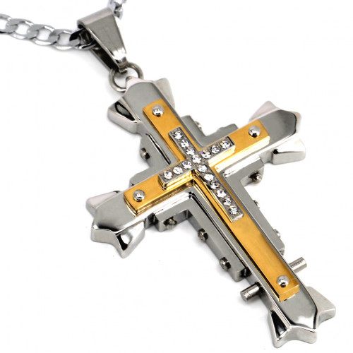 SCOO Men's Large Stainless Steel Gold Silver Cross Biker Pendant Necklace Vintage -with 19 inch Chain